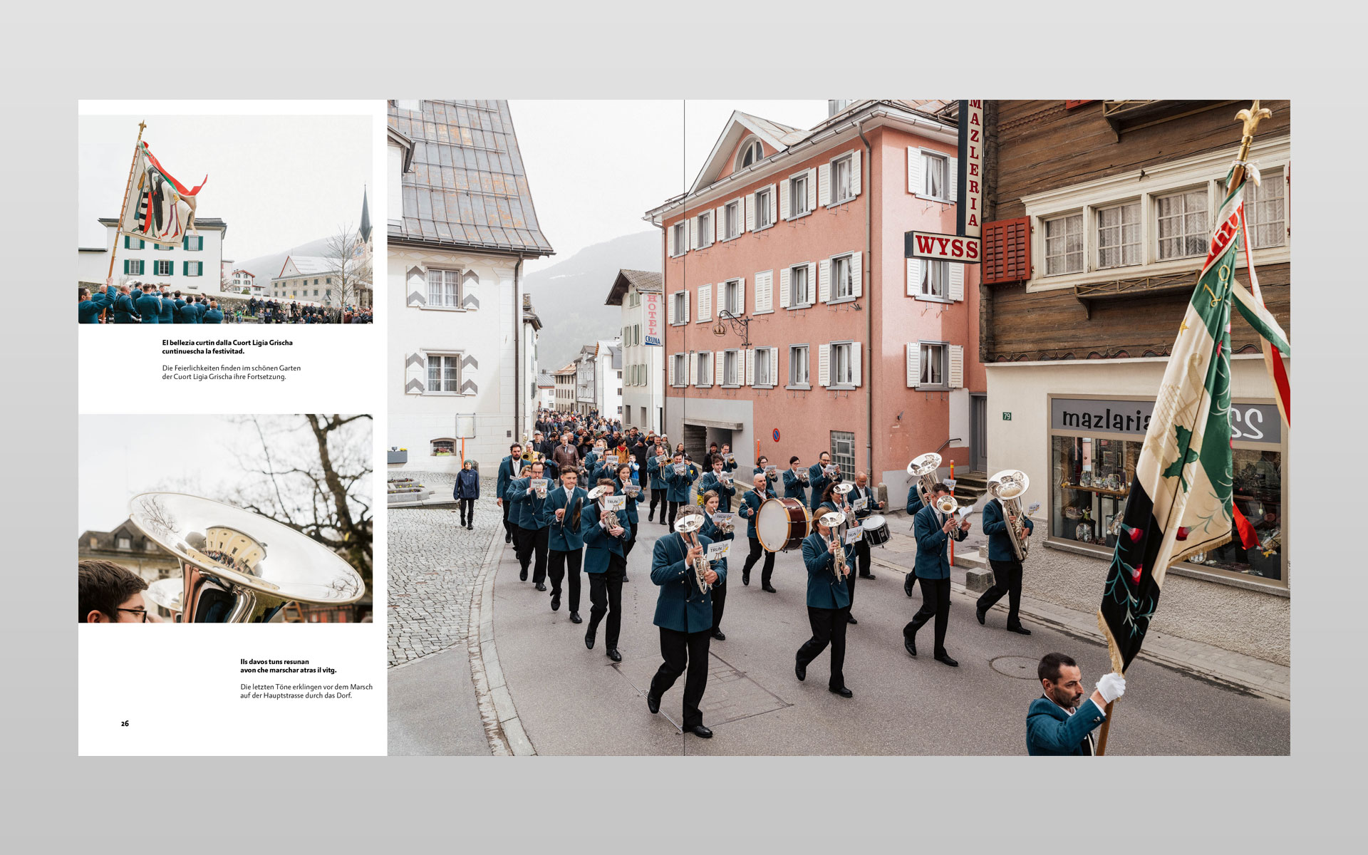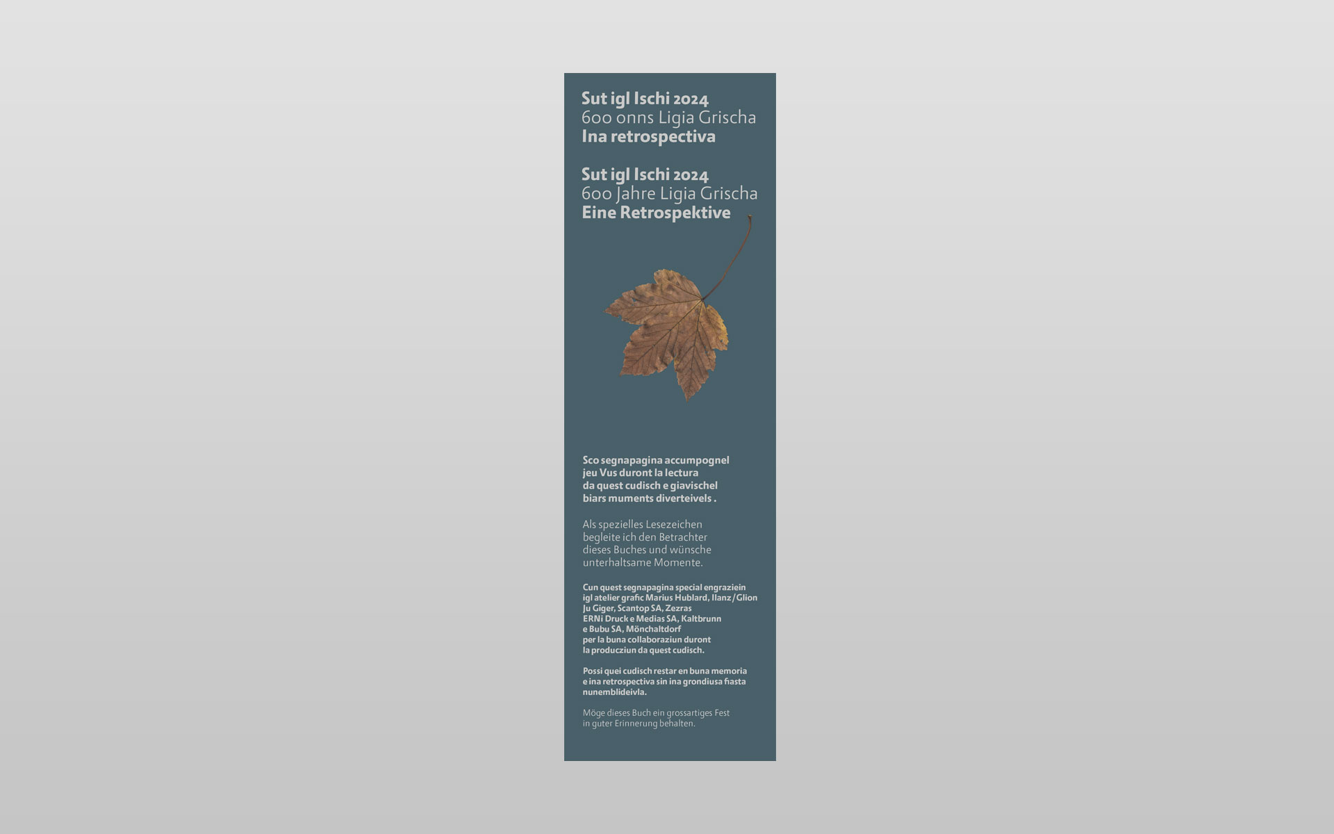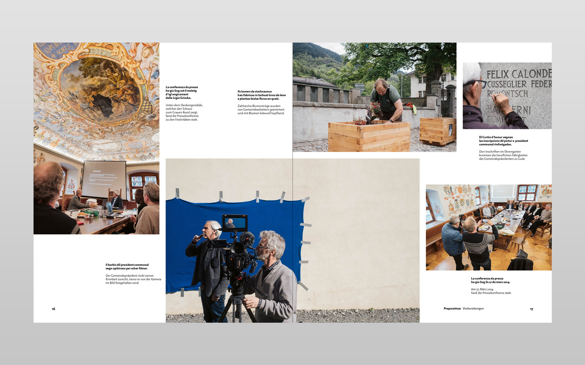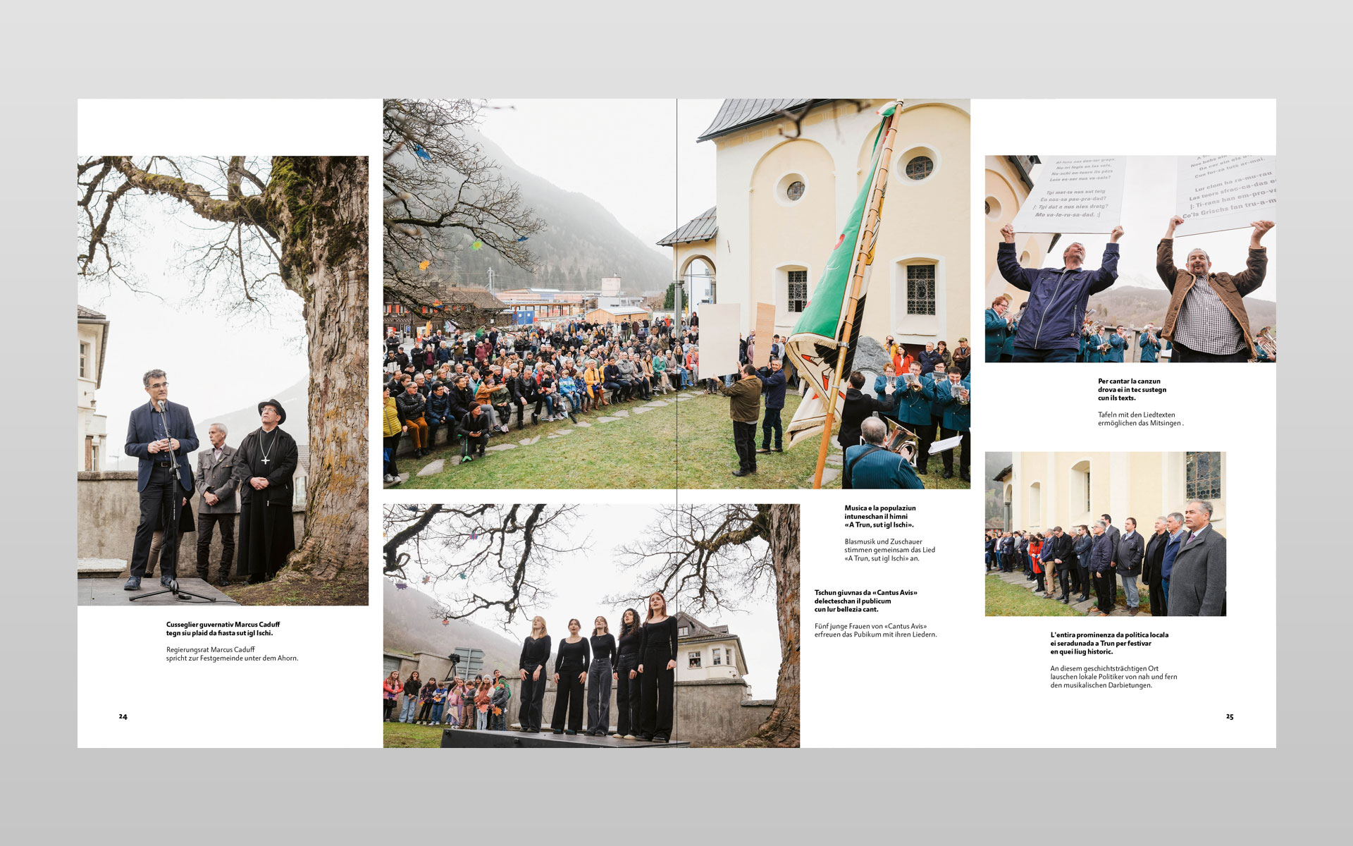 Klick… klick … und nochmals klick – so entstanden unzählige digitale Aufnahmen zu diesem Buchprojekt. Mit geübtem Auge hat der Trunser Fotograf Lotar Tomaschett durch den Sucher seines Fotoapparates mit viel Sensibilität den Grossanlass «600 onns Ligia Grischa» 2024 vom Aufbau bis zum Ende in 277 Aufnahmen festgehalten. Geplant war ein Buch mit anfänglich 96 Seiten welches heute nun mit 204 Seiten aufliegt. Aus sechs grossformatigen Schachteln mit ungezähltem Fotomaterial haben der Fotograf zusammen mit dem Buchgestalter die Bildauswahl getroffen und gemeinsam die Bildlegenden verfasst. Alle Text in Sursilvan und Deutsch. Der Besuch in der Druckerei und anschliessend beim Buchbinder bleiben in bester Erinnerung und die Freude am fertigen Buch gross. Einmal mehr durfte ich in enger Zusammenarbeit mit dem Fotografen ein Buch von A bis Z konzipieren. Die Gestaltung und Druckvorstufe ausführen sowie die von der Scantop Zizers sorgfältig für den Druck eingerichteten Bilder integrieren, schlussendlich diesen seitenreichen Bildtextband während der Produktion begleiten.