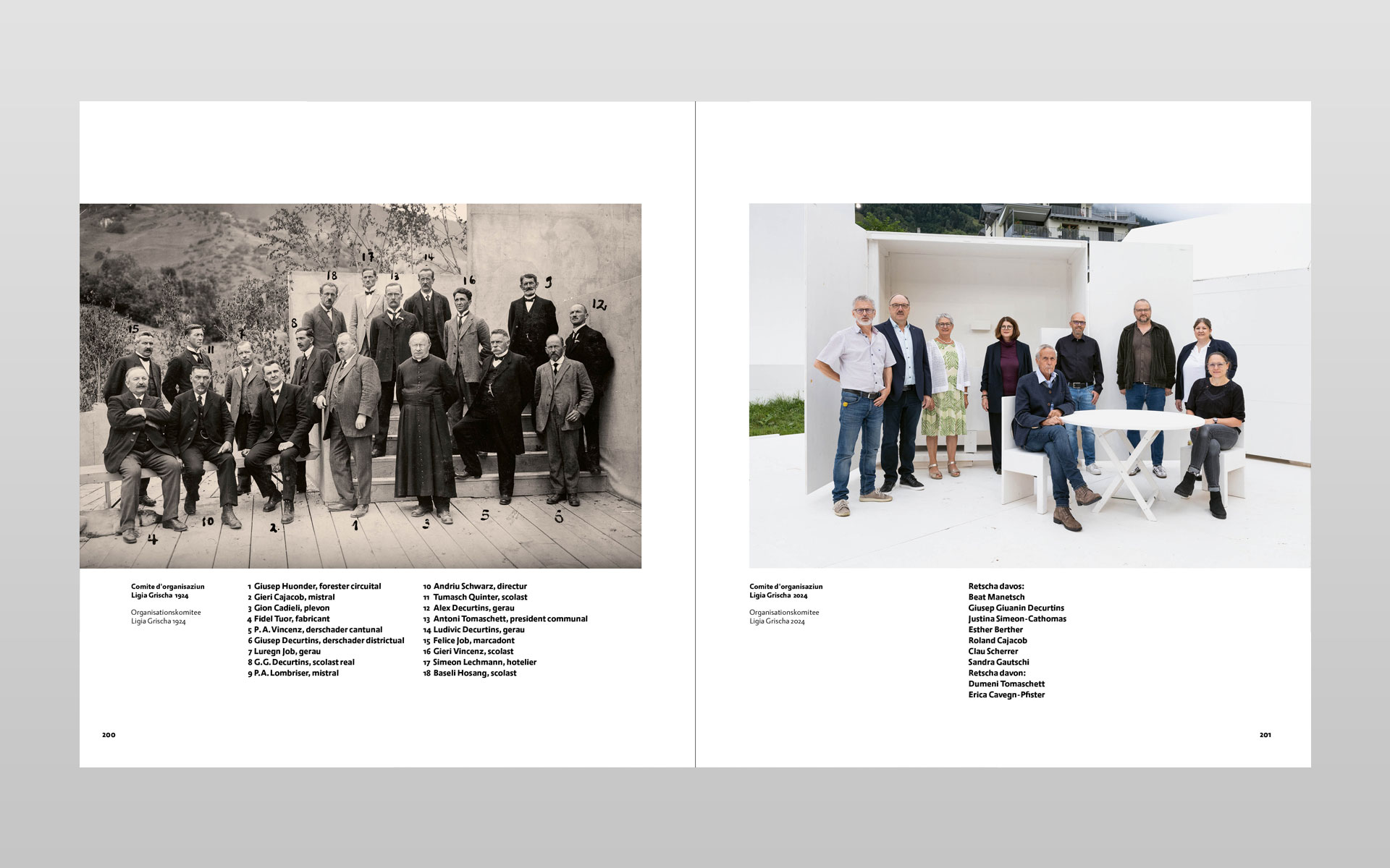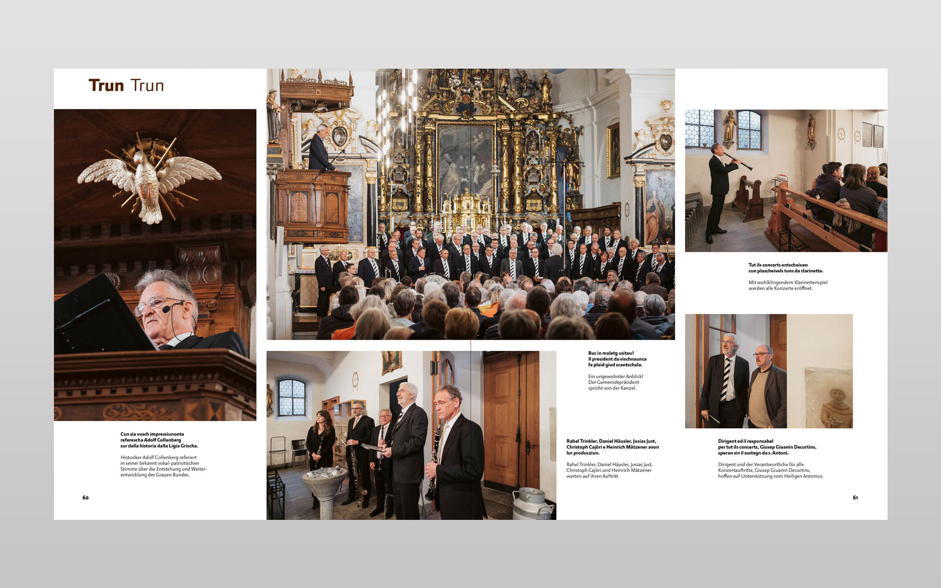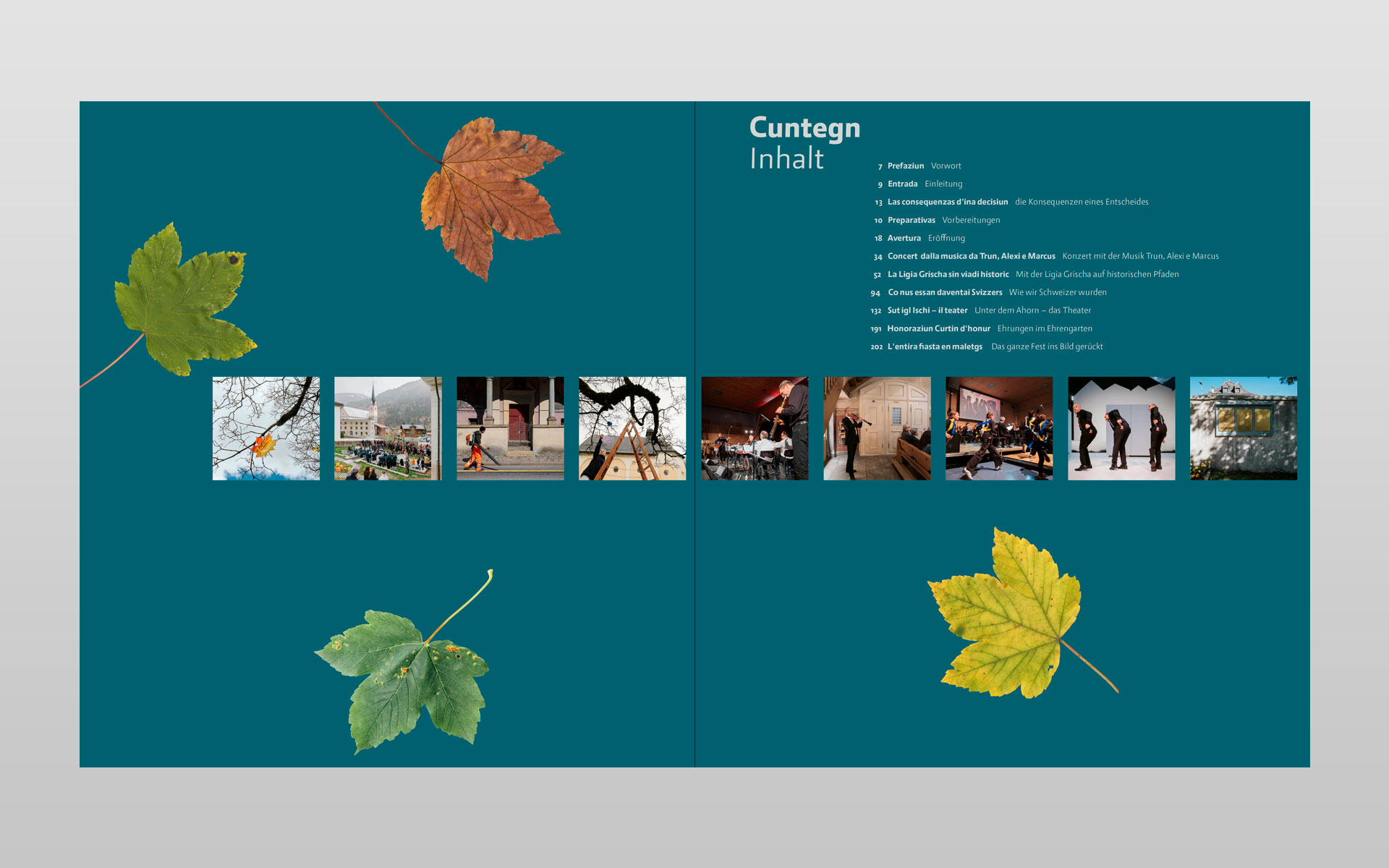Klick… klick … und nochmals klick – so entstanden unzählige digitale Aufnahmen zu diesem Buchprojekt. Mit geübtem Auge hat der Trunser Fotograf Lotar Tomaschett durch den Sucher seines Fotoapparates mit viel Sensibilität den Grossanlass «600 onns Ligia Grischa» 2024 vom Aufbau bis zum Ende in 277 Aufnahmen festgehalten. Geplant war ein Buch mit anfänglich 96 Seiten welches heute nun mit 204 Seiten aufliegt. Aus sechs grossformatigen Schachteln mit ungezähltem Fotomaterial haben der Fotograf zusammen mit dem Buchgestalter die Bildauswahl getroffen und gemeinsam die Bildlegenden verfasst. Alle Text in Sursilvan und Deutsch. Der Besuch in der Druckerei und anschliessend beim Buchbinder bleiben in bester Erinnerung und die Freude am fertigen Buch gross. Einmal mehr durfte ich in enger Zusammenarbeit mit dem Fotografen ein Buch von A bis Z konzipieren. Die Gestaltung und Druckvorstufe ausführen sowie die von der Scantop Zizers sorgfältig für den Druck eingerichteten Bilder integrieren, schlussendlich diesen seitenreichen Bildtextband während der Produktion begleiten.
