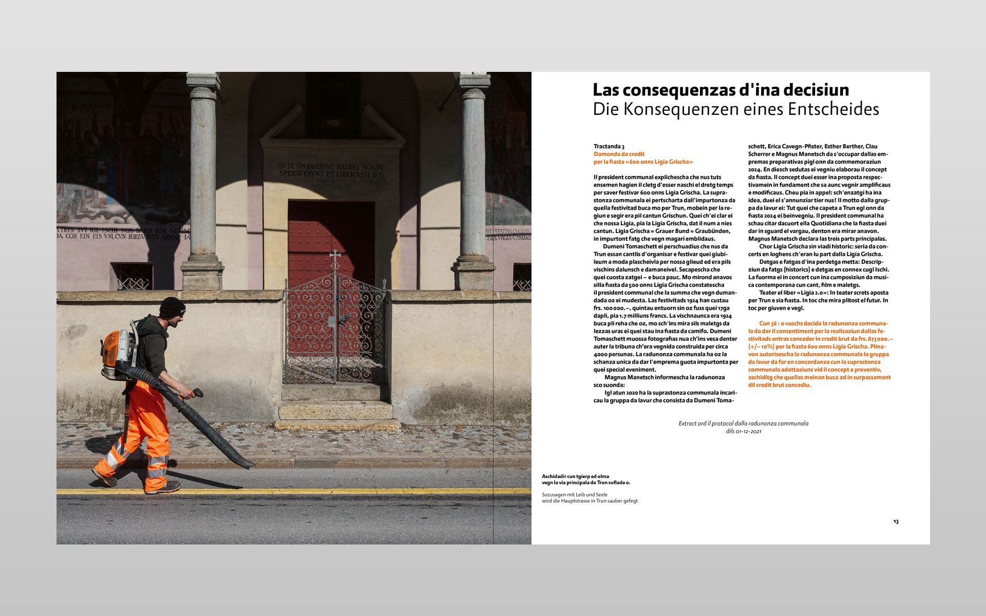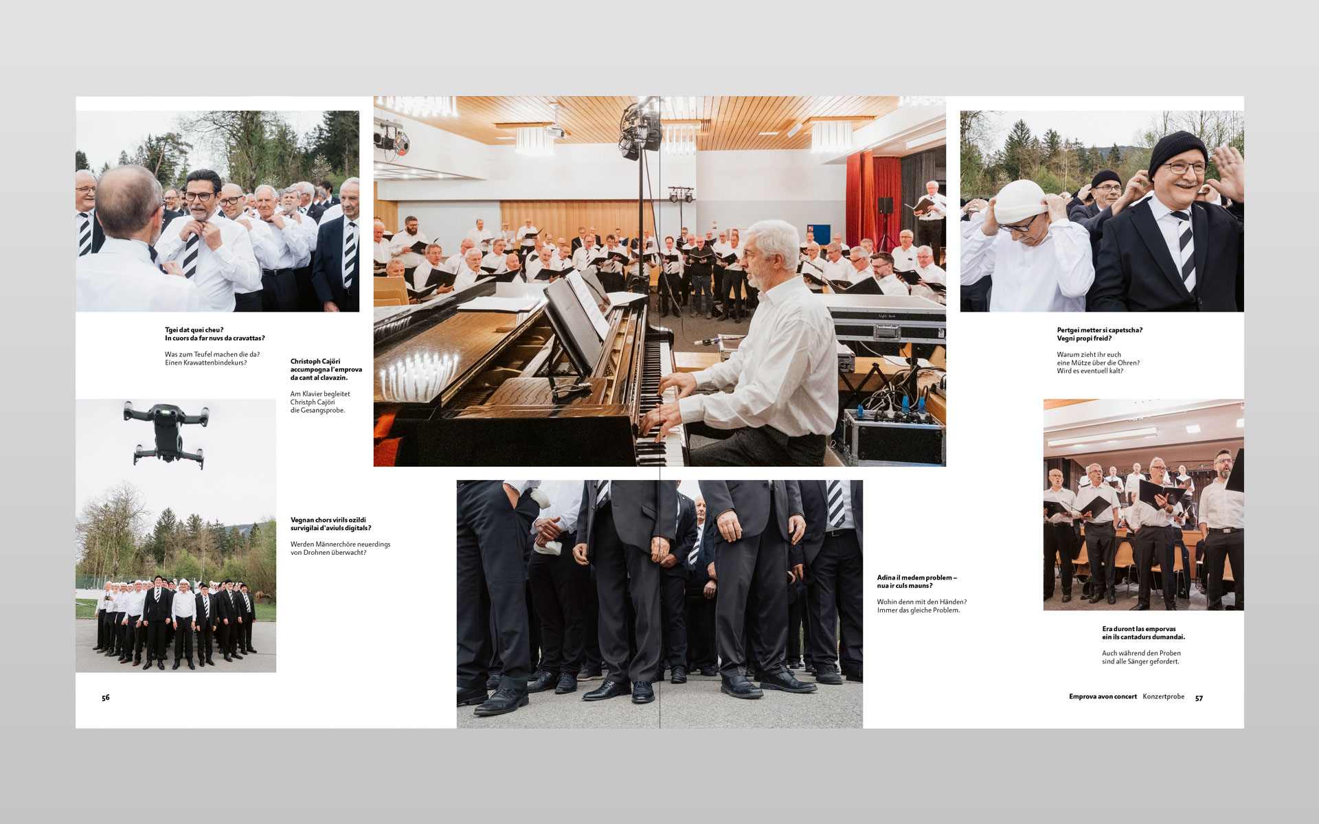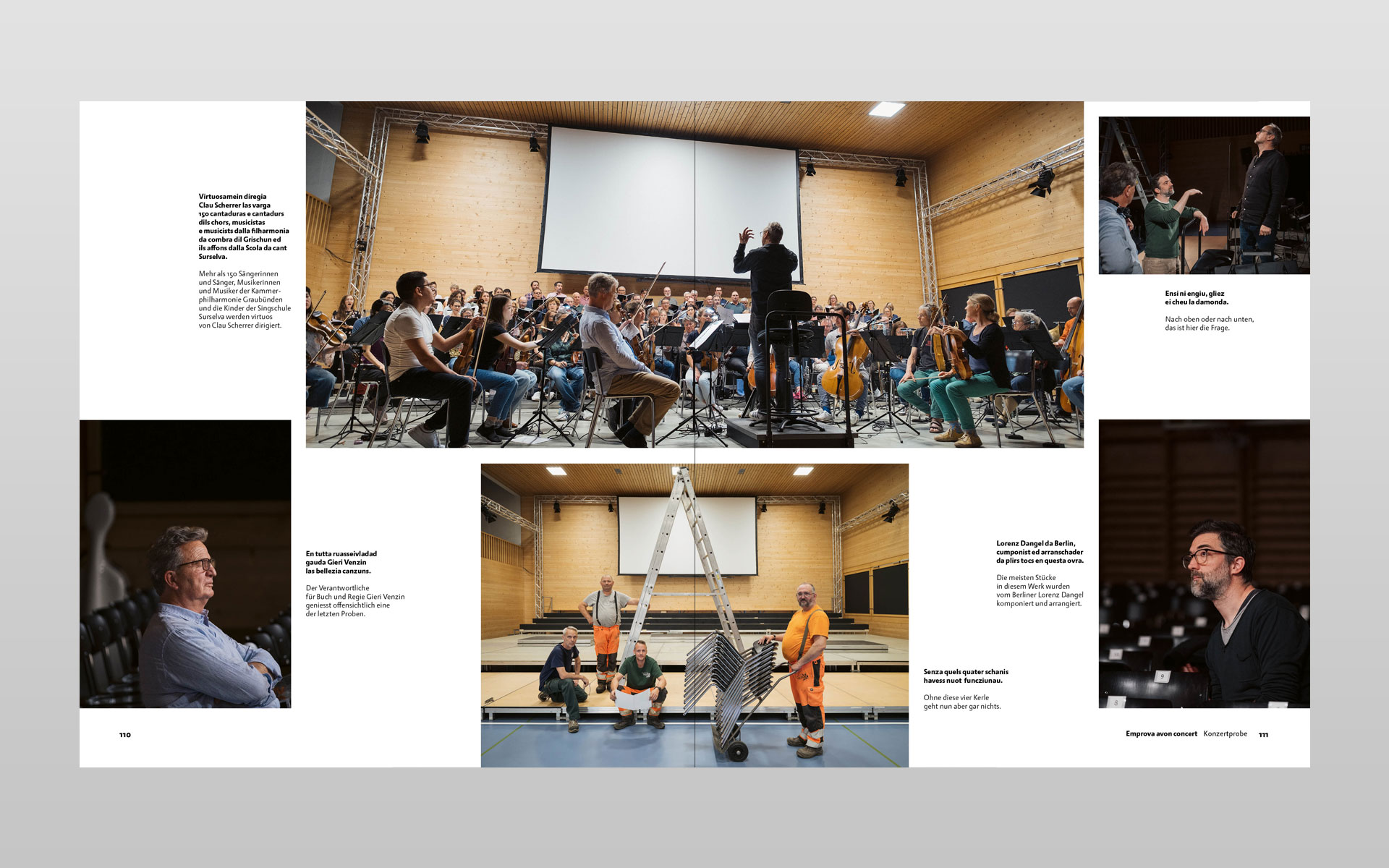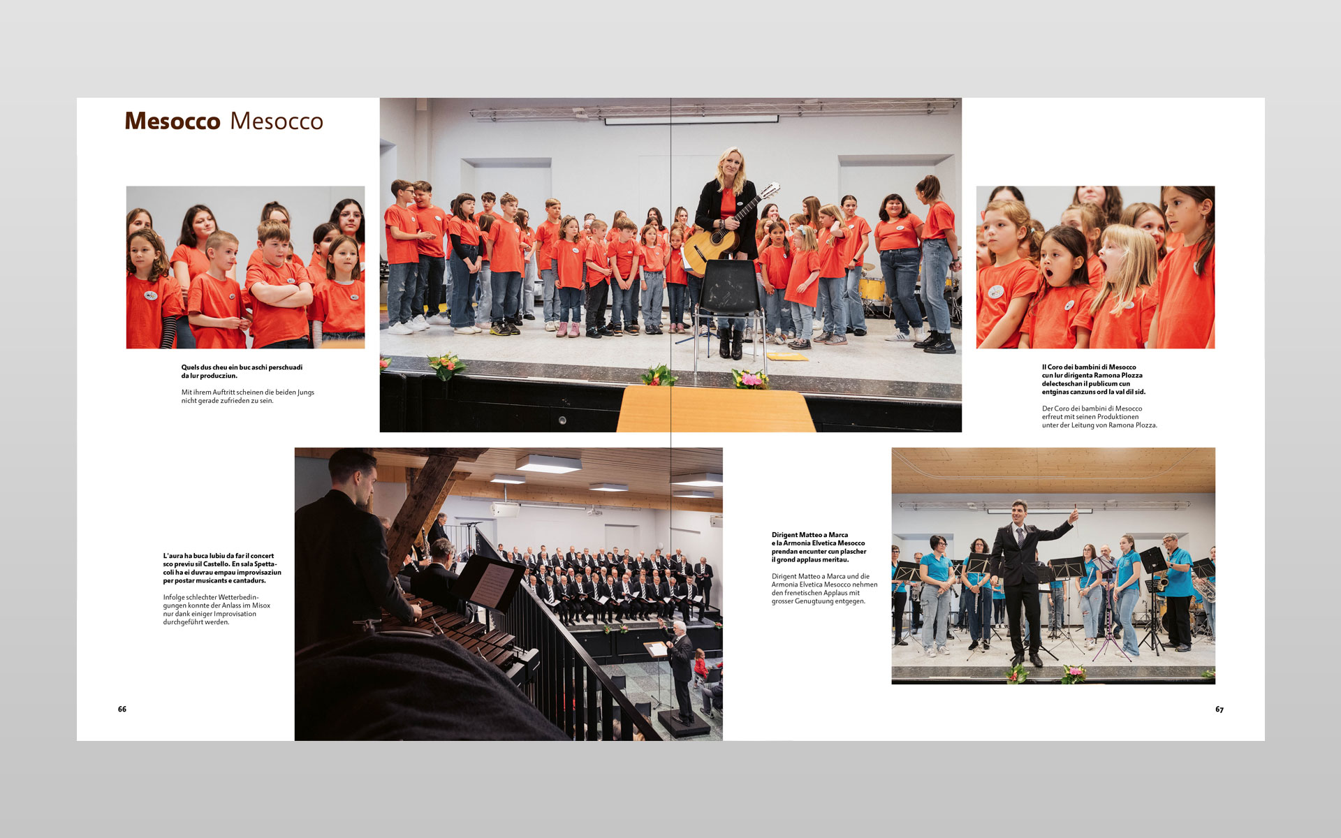 Klick… klick … und nochmals klick – so entstanden unzählige digitale Aufnahmen zu diesem Buchprojekt. Mit geübtem Auge hat der Trunser Fotograf Lotar Tomaschett durch den Sucher seines Fotoapparates mit viel Sensibilität den Grossanlass «600 onns Ligia Grischa» 2024 vom Aufbau bis zum Ende in 277 Aufnahmen festgehalten. Geplant war ein Buch mit anfänglich 96 Seiten welches heute nun mit 204 Seiten aufliegt. Aus sechs grossformatigen Schachteln mit ungezähltem Fotomaterial haben der Fotograf zusammen mit dem Buchgestalter die Bildauswahl getroffen und gemeinsam die Bildlegenden verfasst. Alle Text in Sursilvan und Deutsch. Der Besuch in der Druckerei und anschliessend beim Buchbinder bleiben in bester Erinnerung und die Freude am fertigen Buch gross. Einmal mehr durfte ich in enger Zusammenarbeit mit dem Fotografen ein Buch von A bis Z konzipieren. Die Gestaltung und Druckvorstufe ausführen sowie die von der Scantop Zizers sorgfältig für den Druck eingerichteten Bilder integrieren, schlussendlich diesen seitenreichen Bildtextband während der Produktion begleiten.